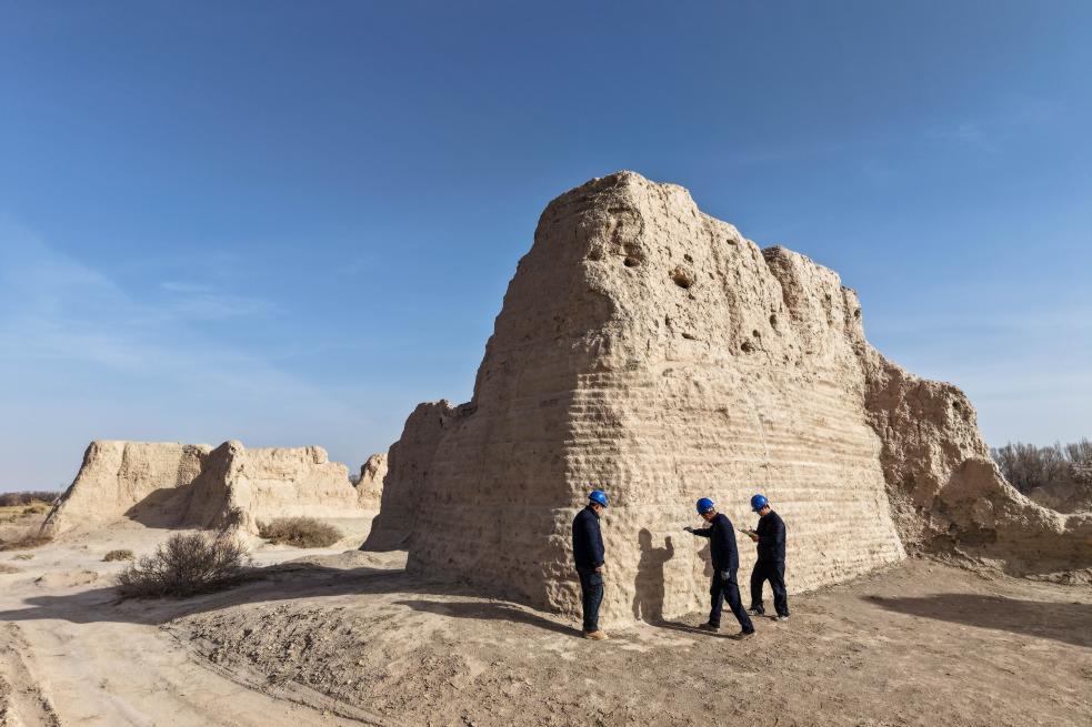敦煌研究院文物保护技术服务中心工作人员观察西墙马面的夯筑支顶加固效果(无人机照片)。新华社记者 郎兵兵 摄