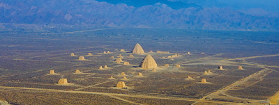 行走在苍茫辽阔的贺兰山下,西夏陵陵塔映照在阳光之中。放眼望去,四边的角台,两边的门阙、碑亭,月城、陵城勾勒出陵区的布局。西夏陵背山面水,西北傍高山,东眺银川与黄河,各座帝陵的空间轴线都与贺兰山的某个山峦顶峰相关联,借山势衬托出恢宏的气势。