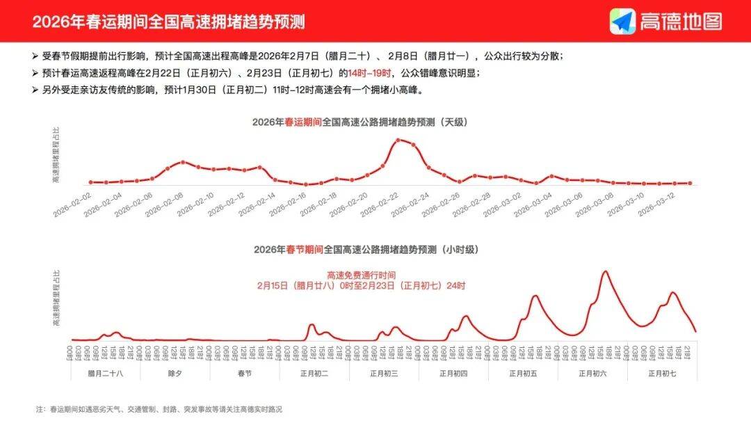 根据高德发布的《2026年春运出行预测报告》(以下简称《报告》),今年春运出行将呈现节前节后“双高峰”形态。节前出程高峰预计在2月7日、2月8日(腊月二十、腊月二十一),而节后返程高峰则预计出现在2月22日、2月23日(正月初六、初七)下午。此外,受传统走亲访友习惯影响,正月初二(2月18日)中午时段或将出现短暂的拥堵小高峰。
