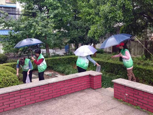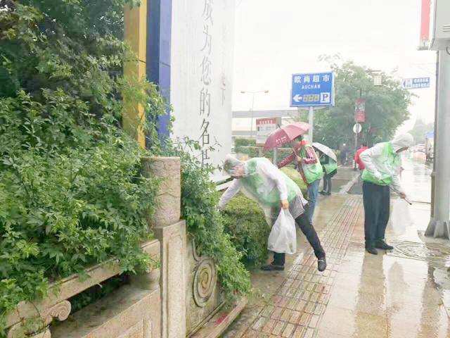 园社区冒着大雨积极开展“十清”行动——“全城道路绿带清垃圾”专题行动。全体社工和志愿者兵分十路对桃园新村、北大街280弄、桃园公寓、温宿路16弄和辖区主干道开展集中整治,清理绿化带垃圾。
